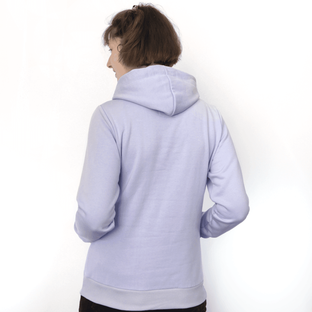 Hoodie für Frauen in flieder, hergestellt aus Biobaumwolle. Mit Schalkragen und praktischer Tasche. Kapuzeninnenfutter und Kordel sind in grau gehalten. Eine zusätzliche Kordel für den Kapuzenpullover in deiner Wunschfarbe gibt es kostenlos dazu. Eine Sicherheitsnadel zum leichten Einfädeln legen wir bei.