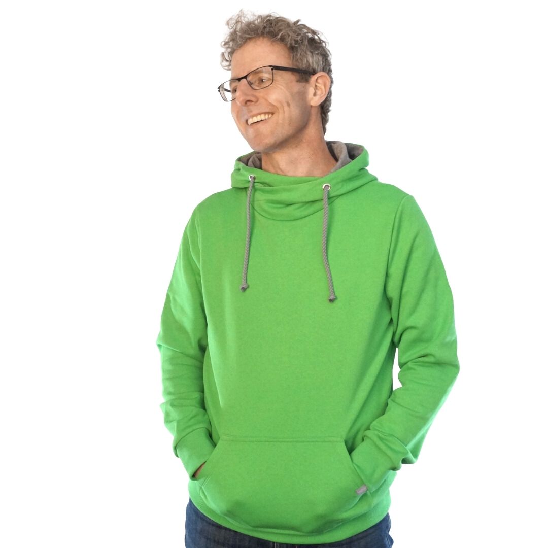 Kapuzen-Hoodie für Männer in grün, hergestellt aus Biobaumwolle. Mit Schalkragen und praktischer Tasche. Kapuzeninnenfutter und Kordel sind in grau gehalten. Eine zusätzliche Kordel für den Kapuzenpullover in deiner Wunschfarbe gibt es kostenlos dazu. Eine Sicherheitsnadel zum leichten Einfädeln legen wir bei.