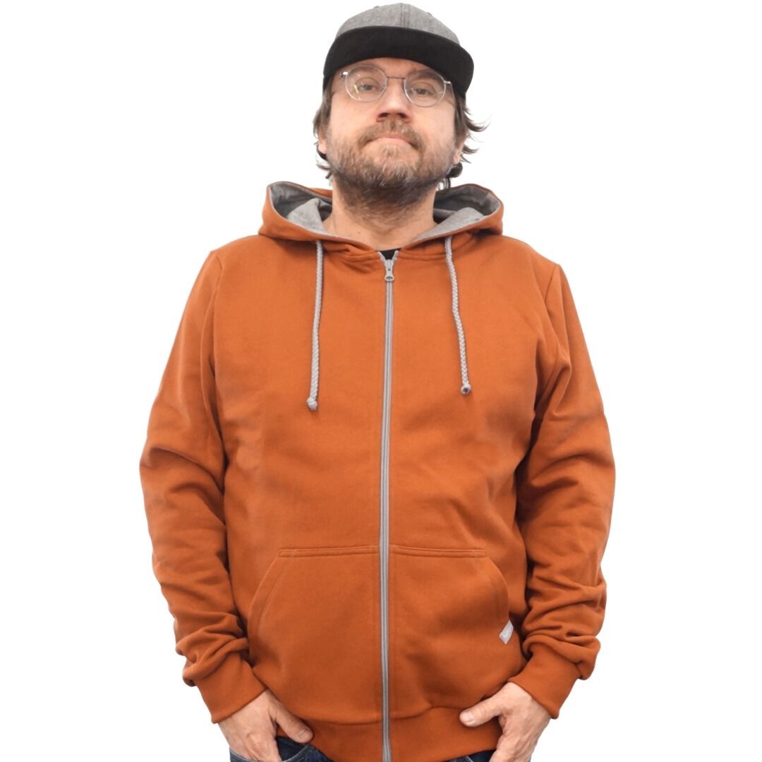 Jacke mit Kapuze für Männer in henna, hergestellt aus Biobaumwolle. Kapuzeninnenfutter und Kordel sind in grau gehalten. Eine zusätzliche Kordel für den Kapuzenpullover in deiner Wunschfarbe gibt es kostenlos dazu. Eine Sicherheitsnadel zum leichten Einfädeln legen wir bei.
