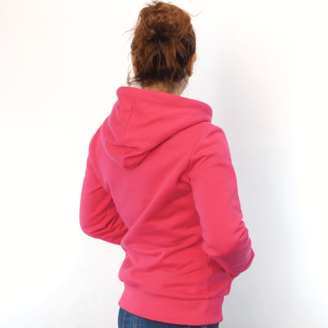 Eine Kapuzenjacke für Frauen in pink, hergestellt aus Biobaumwolle. Kapuzeninnenfutter und Kordel sind in grau gehalten. Eine zusätzliche Kordel für den Kapuzenpullover in deiner Wunschfarbe gibt es kostenlos dazu. Eine Sicherheitsnadel zum leichten Einfädeln legen wir bei.