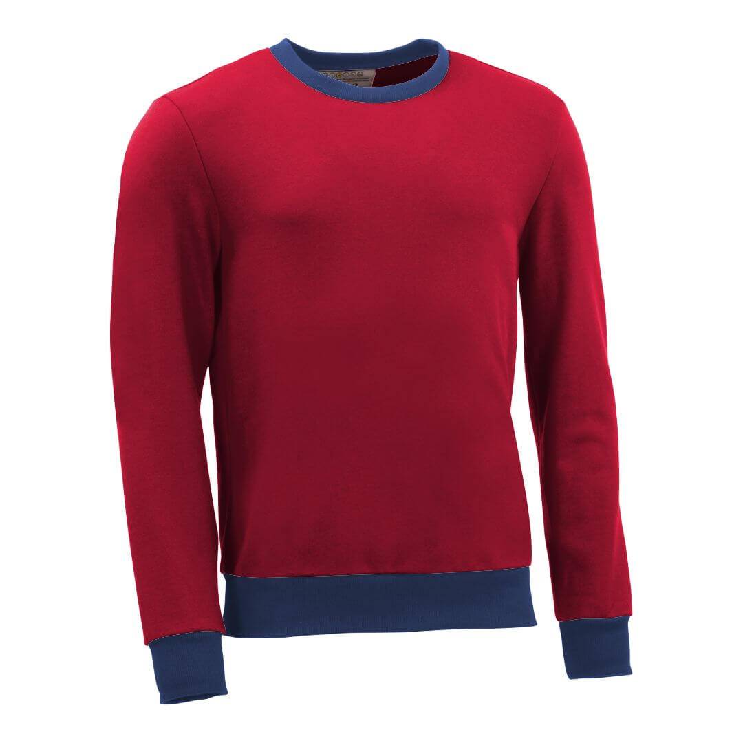 Dieses Sweatshirt mit Rundhals-Ausschnitt in Chilirot und Tiefseeblau (oder Farben nach deiner Wahl) fertigen wir in tailliert oder nicht tailliert. Der Stoff besteht aus Bio-Baumwolle. Komplett hergestellt in Deutschland, in unserer Manufaktur in Esslingen bei Stuttgart.