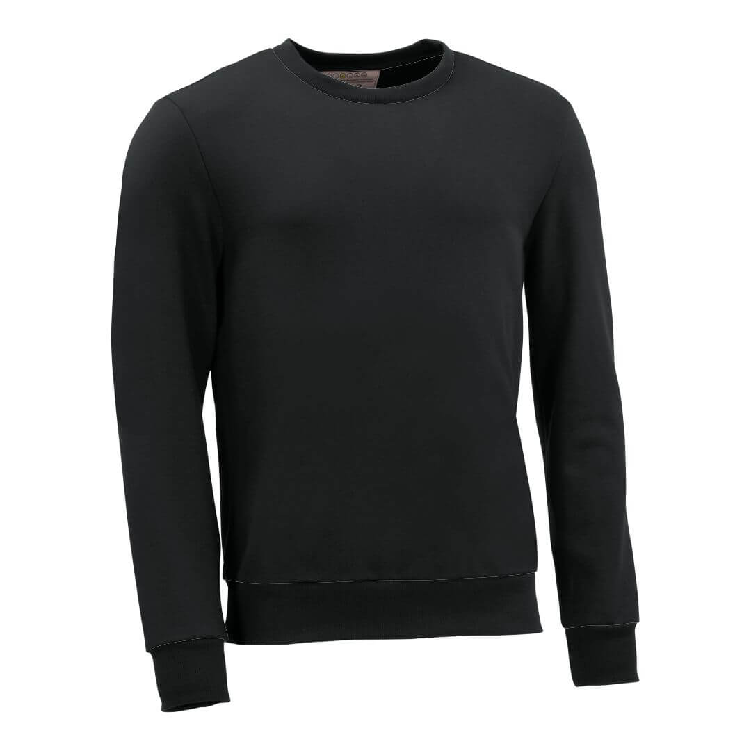 Rundhalspullover in Schwarz. Sweatstoff aus 100% Biobaumwolle. Unsere Pullover werden in unserem Unternehmen in Esslingen entworfen und gefertigt und 100% bei uns in der Manufaktur genäht.  Auch als Sweatshirt in den Schnittvarianten Pullover mit Schalkragen oder Pullover mit V-Ausschnitt.