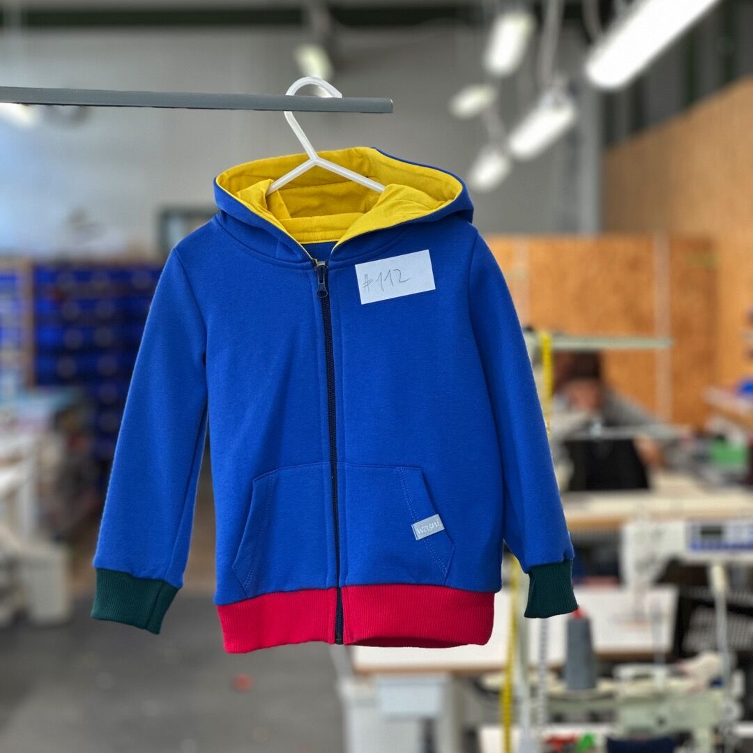 Kapuzenjacke ohne Kordeln in der Farbe Kornblume mit bunten Akzenten für Kinder in Größe 98, hergestellt aus Biobaumwolle.