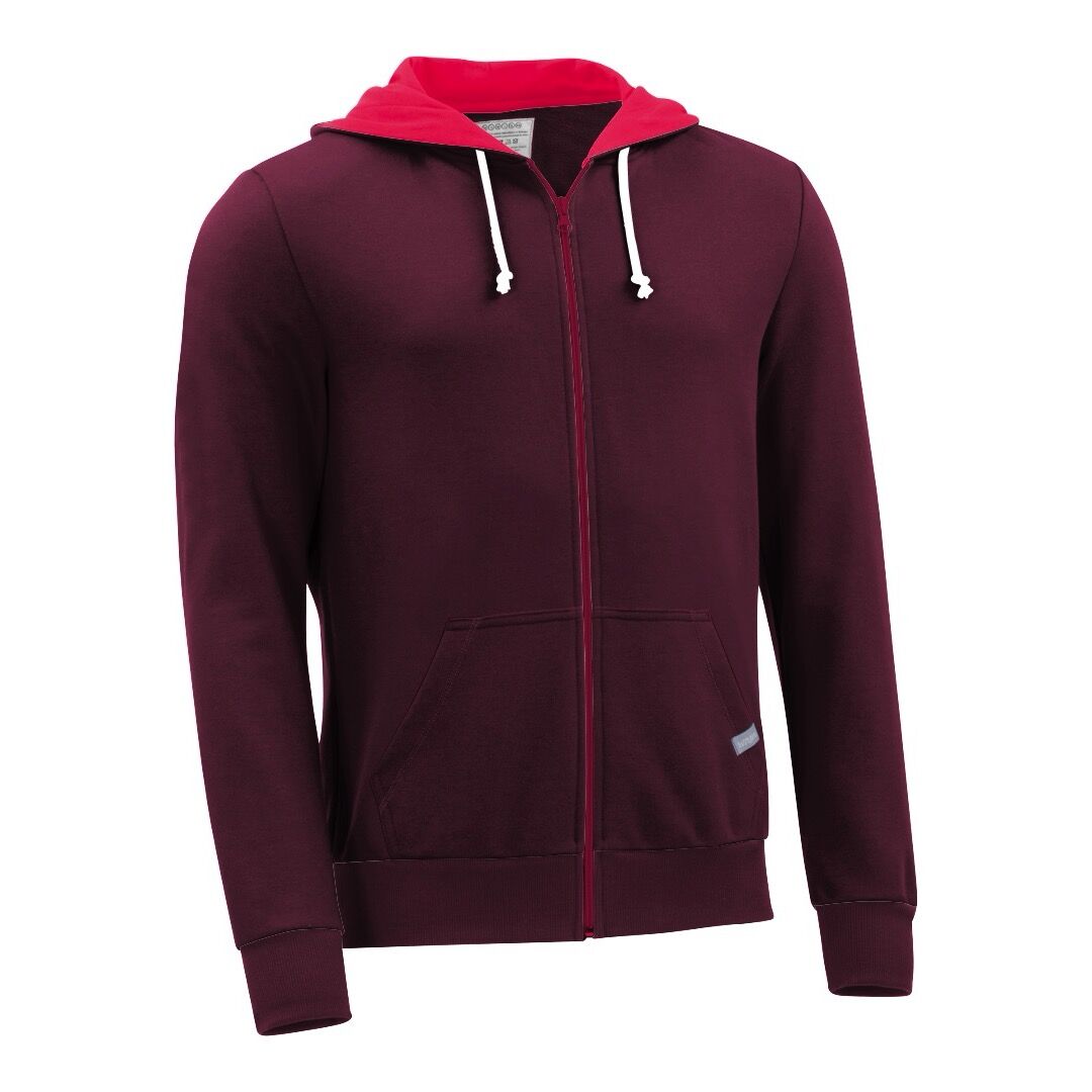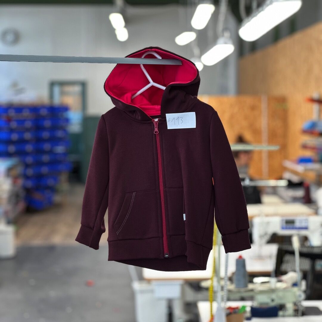 Kapuzenjacke ohne Kordeln in der Farbe Bordeaux für Kinder in Größe 92, hergestellt aus Biobaumwolle.
