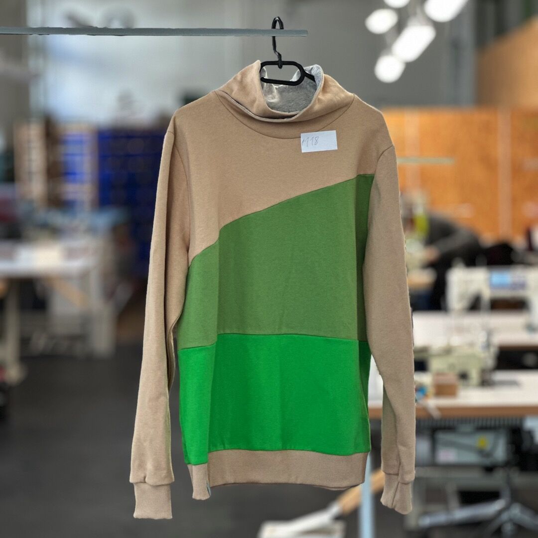 Schalkragenpullover in den Farben Sand, Opuntia und Knallgrün für Männer in Größe L. Hergestellt aus Biobaumwolle.