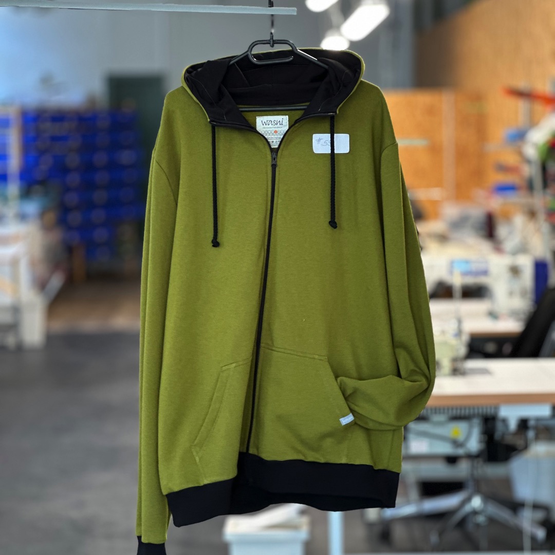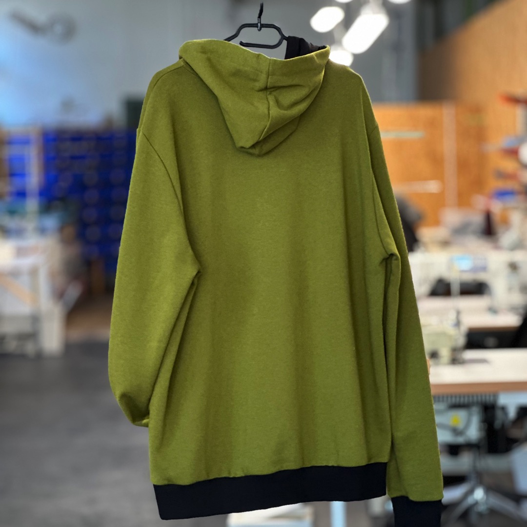 Kapuzenjacke mit hohem Reißverschluss für Männer in Olivgrün in Größe XXL. Die Ärmel sowie den Rumpf haben wir 4cm länger gefertigt, sowie beim Taillenumfang 8cm zugegeben.
