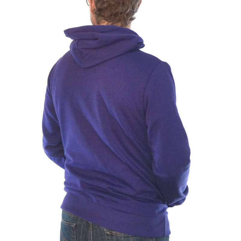 Sweater-Hoodie für Männer in lila, hergestellt aus Biobaumwolle. Mit Schalkragen und praktischer Tasche. Kapuzeninnenfutter und Kordel sind in grau gehalten. Eine zusätzliche Kordel für den Kapuzenpullover in deiner Wunschfarbe gibt es kostenlos dazu. Eine Sicherheitsnadel zum leichten Einfädeln legen wir bei.