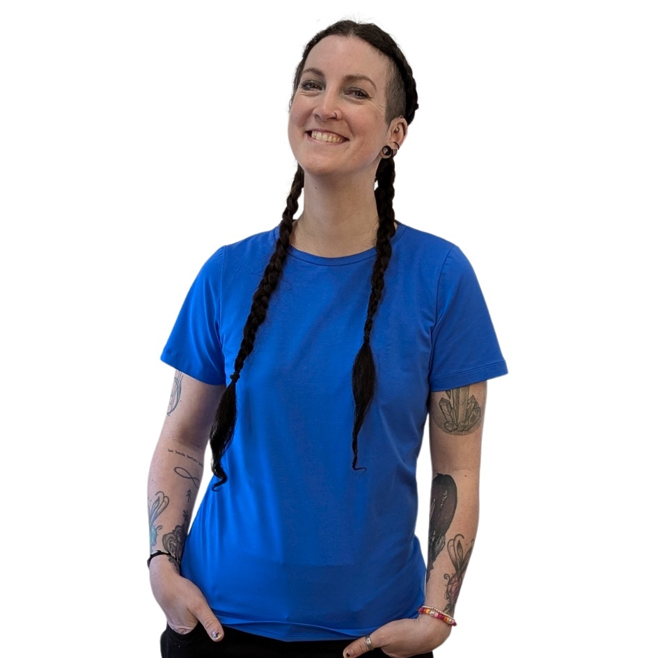 Ein tailliert geschnittenes T-Shirt für Frauen aus Stretch Jersey (95% Bio-Baumwolle, 5% Elasthan). Die Farbe des Stoffes und des Druck bestimmst du selbst. Dieses T-Shirt wird so nachhaltig und fair wie irgend möglich hergestellt. Der Stoff ist GOTS-zertifiziert – heißt: Bei der Aufzucht der Baumwolle wird vollständig auf die Verwendung von genmanipuliertem Saatgut, mineralölbasierenden Kunstdüngern und Pestizide verzichtet. Gestrickt und gefärbt wird der angenehme Jersey-Stoff in Portugal. Und alles unter Einhaltung sozialer Standards: Mindestlohn, Betriebsratgründungen, Arbeitssicherheit – ansonsten gibt es kein GOTS-Zertifikat. Darauf achten wir beim Einkauf. Das Design, die Schnitterstellung, Zuschnitt und Nähen – dies passiert dann alles in unserer inklusiven Manufaktur in Esslingen in Deutschland. Die Größen für Frauen schneidern wir in XS, S, M, L, XL, XXL und 3XL. (Schnittmaße siehe Fotos) Du möchtest ein anderes Druckmotive oder ein einfaches Basic-Shirt? Hier findest du die Übersicht T-Shirts für Frauen.