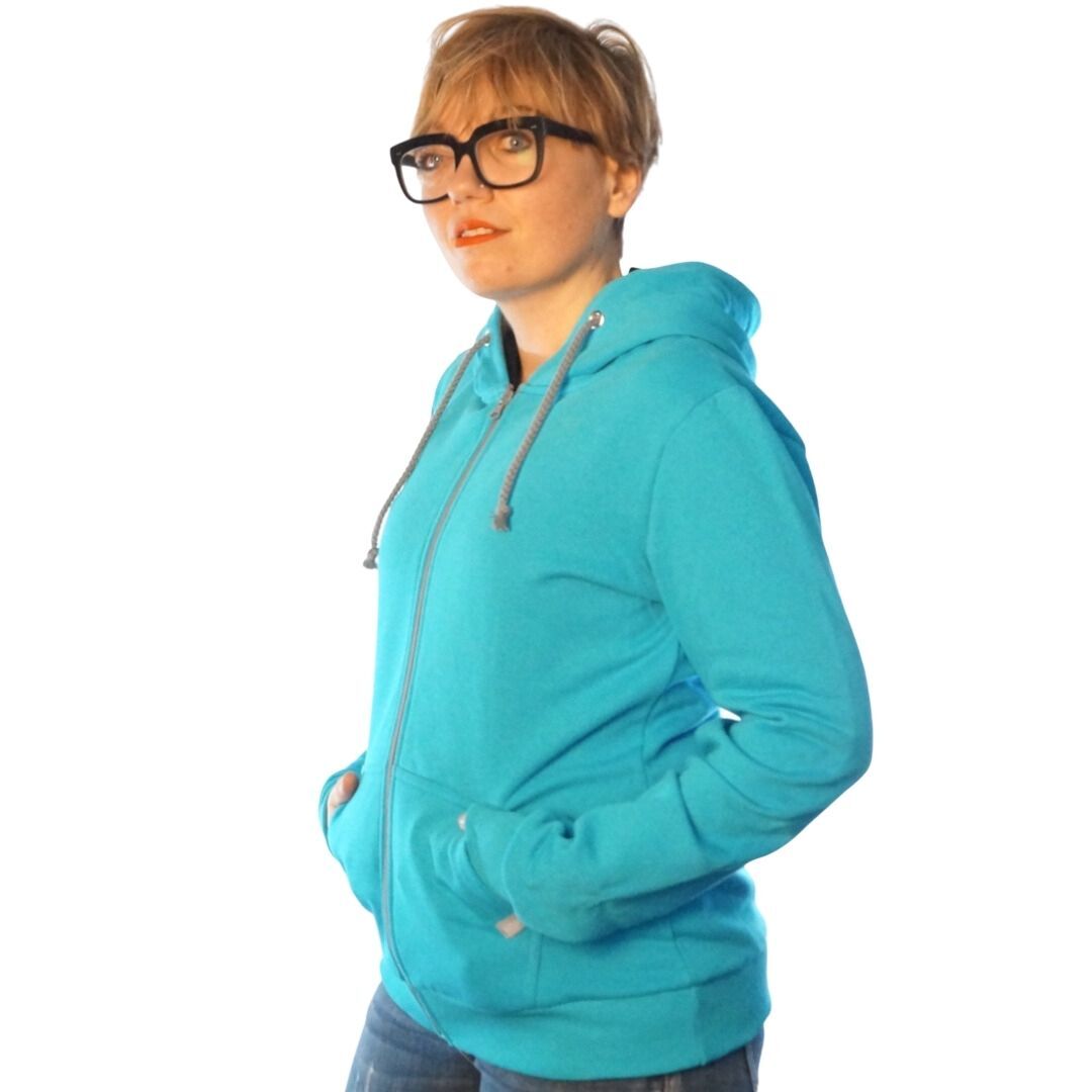 Zipper mit Kapuze für Frauen in türkis, hergestellt aus Biobaumwolle. Kapuzeninnenfutter und Kordel sind in grau gehalten. Eine zusätzliche Kordel für den Kapuzenpullover in deiner Wunschfarbe gibt es kostenlos dazu. Eine Sicherheitsnadel zum leichten Einfädeln legen wir bei.